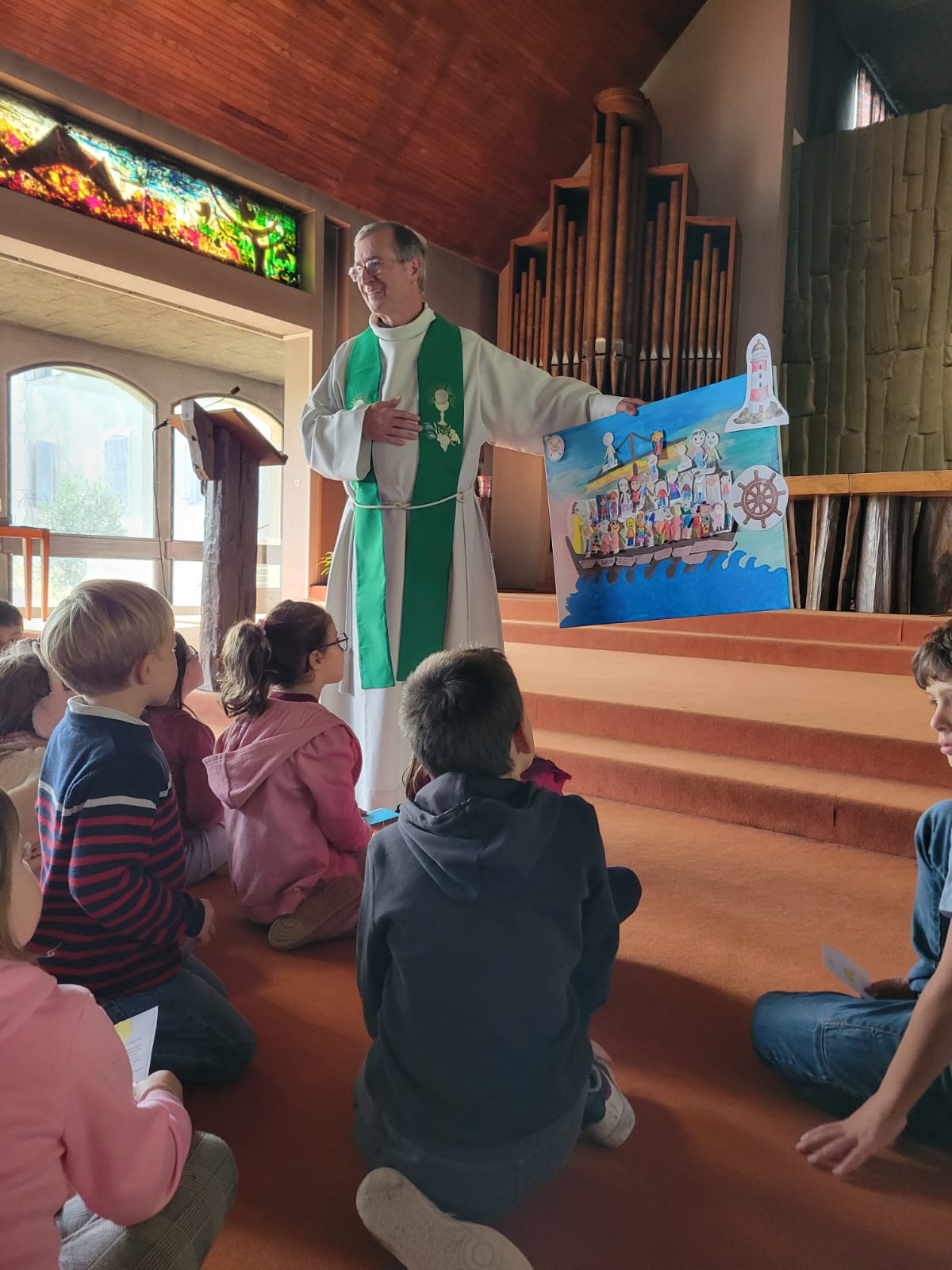 Le samedi 11 octobre 2025, nous avons fait une journée conviviale à l’abbaye de la Rochette de Belmont Tramonet afin de mieux nous connaître en ce début d’année de catéchisme. Le thème choisi était Suivre Jésus. Nous avons débuté la journée avec un temps de chants, puis chaque enfant a rejoint son groupe d’âge avec ses catéchistes. Nous avons réfléchi dans les groupes sur qui était Jésus et pourquoi on voulait le suivre. Après une lecture d’images sur la vie de Jésus, nous avons eu un temps de bricolage où chaque enfant s’est dessiné sur un bonhomme. Les enfants ont été invités ensuite à coller leur bonhomme sur la barque conduite par Jésus, symbolisant ainsi leur volonté d’être avec lui tout au long de cette année.