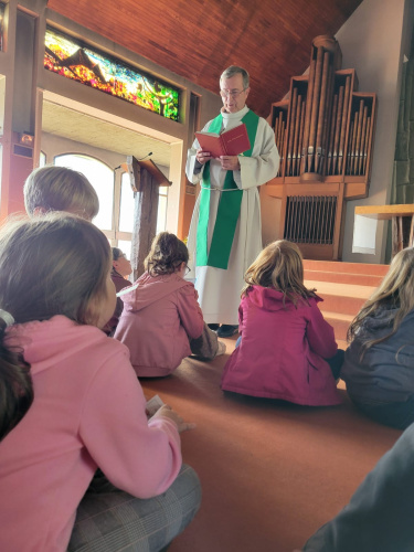 L’après-midi, trois ateliers ont été mis en place : un atelier « pêche à la ligne » avec des questions sur Jésus, un atelier Bible avec l’évangile de Mathieu 4 18-22 (« Laissant là leur filet, ils le suivirent ») et un atelier sport pour coopérer et se défouler. Nous avons terminé la journée à la chapelle de l’Abbaye avec la visite du père Brac et des familles. Le Père a repris l’évangile abordé en atelier et Hugo a pu faire une étape de sa demande de baptême.